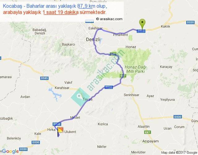 Kocabaş - Baharlar arası yaklaşık olarak 90 km/h ile yukarıda belirtilen sürede olup, iki yerin kuş uçuşu uzaklığı (mesafesi) 53'dir. Yolculuk otobüsle 1 saat 42 dakika sürmektedir.
