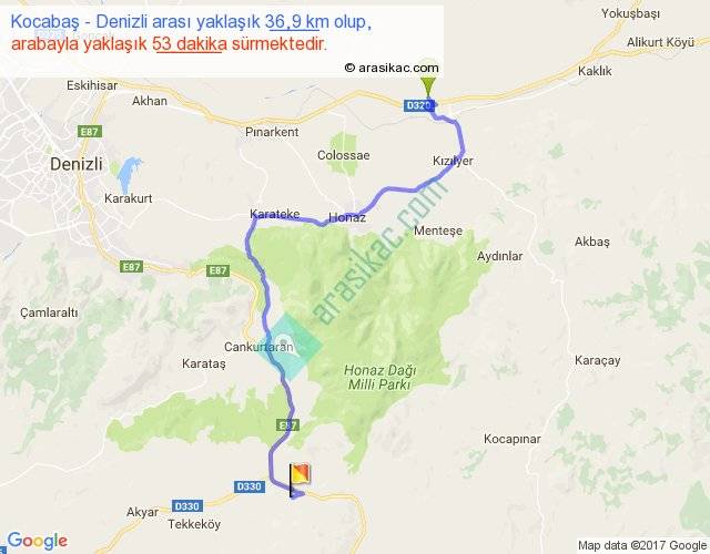 Kocabaş - Denizli arası yaklaşık olarak 90 km/h ile yukarıda belirtilen sürede olup, iki yerin kuş uçuşu uzaklığı (mesafesi) 23'dir. Yolculuk otobüsle 1 saat 8 dakika sürmektedir.