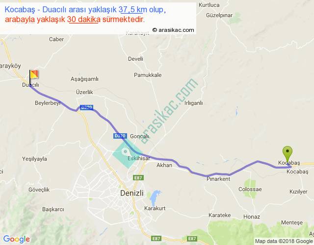 Kocabaş - Duacılı arası yaklaşık olarak 90 km/h ile yukarıda belirtilen sürede olup, iki yerin kuş uçuşu uzaklığı (mesafesi) 33'dir. Yolculuk otobüsle 39 dakika sürmektedir.
