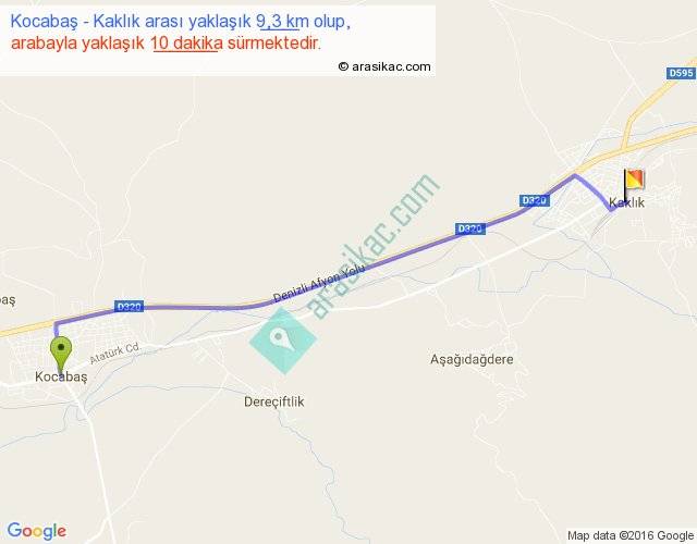Kocabaş - Kaklık arası yaklaşık olarak 90 km/h ile yukarıda belirtilen sürede olup, iki yerin kuş uçuşu uzaklığı (mesafesi) 8'dir. Yolculuk otobüsle 13 dakika sürmektedir.
