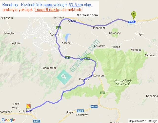 Kocabaş - Kızılcabölük arası yaklaşık olarak 90 km/h ile yukarıda belirtilen sürede olup, iki yerin kuş uçuşu uzaklığı (mesafesi) 34'dir. Yolculuk otobüsle 1 saat 28 dakika sürmektedir.
