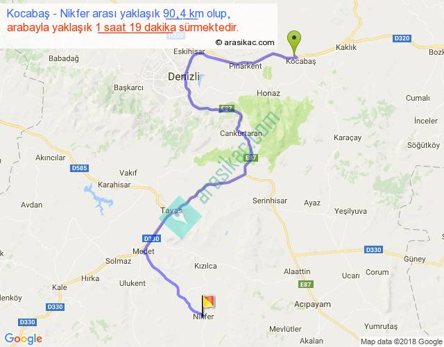Kocabaş - Nikfer arası yaklaşık olarak 90 km/h ile yukarıda belirtilen sürede olup, iki yerin kuş uçuşu uzaklığı (mesafesi) 48'dir. Yolculuk otobüsle 1 saat 42 dakika sürmektedir.