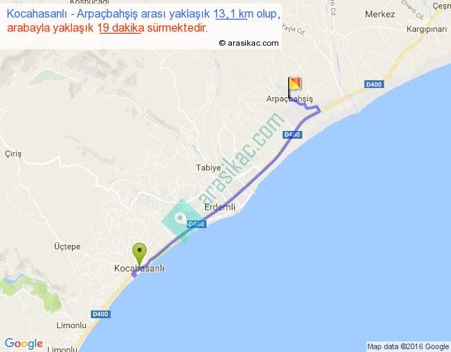 Kocahasanlı - Arpaçbahşiş arası yaklaşık olarak 90 km/h ile yukarıda belirtilen sürede olup, iki yerin kuş uçuşu uzaklığı (mesafesi) 10'dir. Yolculuk otobüsle 24 dakika sürmektedir.