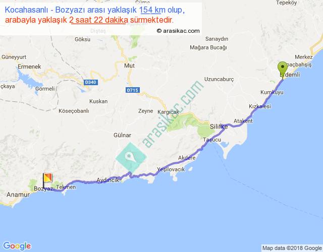Kocahasanlı - Bozyazı arası yaklaşık olarak 90 km/h ile yukarıda belirtilen sürede olup, iki yerin kuş uçuşu uzaklığı (mesafesi) 127'dir. Yolculuk otobüsle 3 saat 4 dakika sürmektedir.