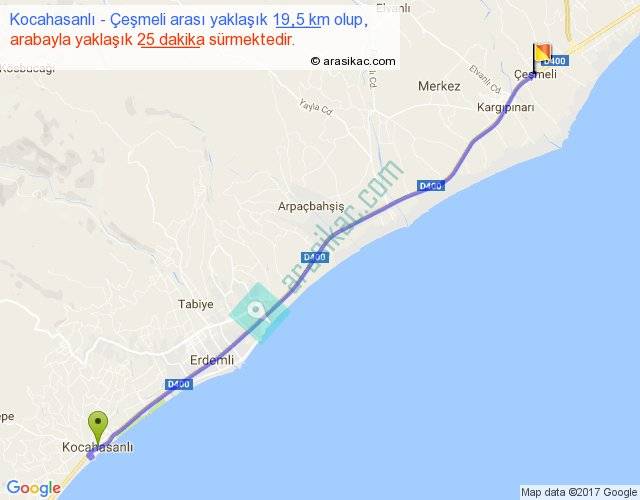 Kocahasanlı - Çeşmeli arası yaklaşık olarak 90 km/h ile yukarıda belirtilen sürede olup, iki yerin kuş uçuşu uzaklığı (mesafesi) 18'dir. Yolculuk otobüsle 32 dakika sürmektedir.