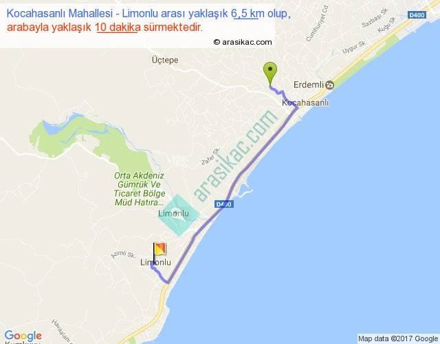 Kocahasanlı Mahallesi - Limonlu arası yaklaşık olarak 90 km/h ile yukarıda belirtilen sürede olup, iki yerin kuş uçuşu uzaklığı (mesafesi) 5'dir. Yolculuk otobüsle 13 dakika sürmektedir.