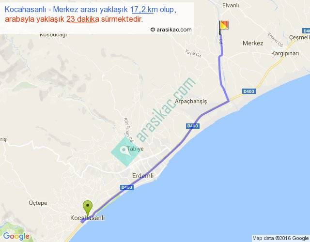 Kocahasanlı - Merkez arası yaklaşık olarak 90 km/h ile yukarıda belirtilen sürede olup, iki yerin kuş uçuşu uzaklığı (mesafesi) 14'dir. Yolculuk otobüsle 29 dakika sürmektedir.