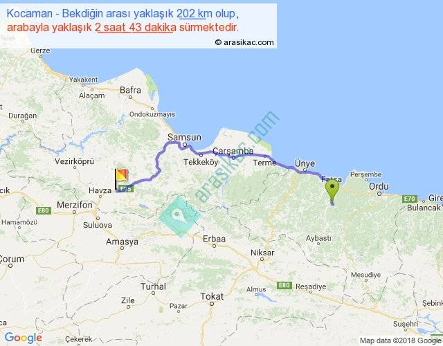 Kocaman - Bekdiğin arası yaklaşık olarak 90 km/h ile yukarıda belirtilen sürede olup, iki yerin kuş uçuşu uzaklığı (mesafesi) 144'dir. Yolculuk otobüsle 3 saat 31 dakika sürmektedir.