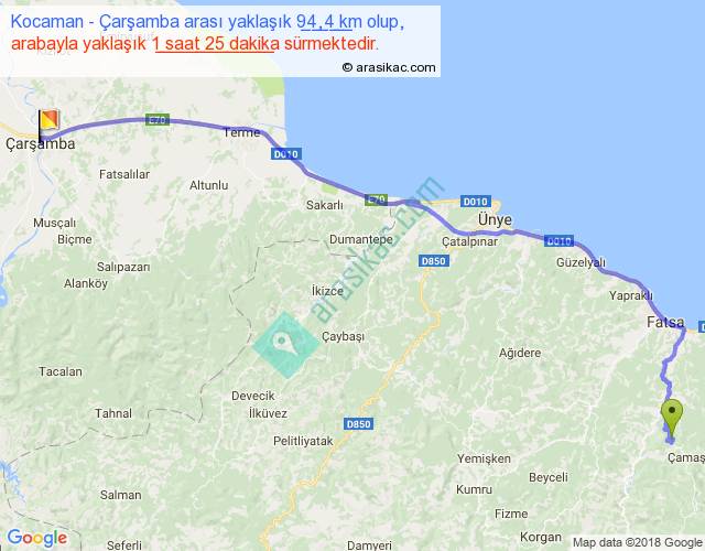 Kocaman - Çarşamba arası yaklaşık olarak 90 km/h ile yukarıda belirtilen sürede olup, iki yerin kuş uçuşu uzaklığı (mesafesi) 72'dir. Yolculuk otobüsle 1 saat 50 dakika sürmektedir.