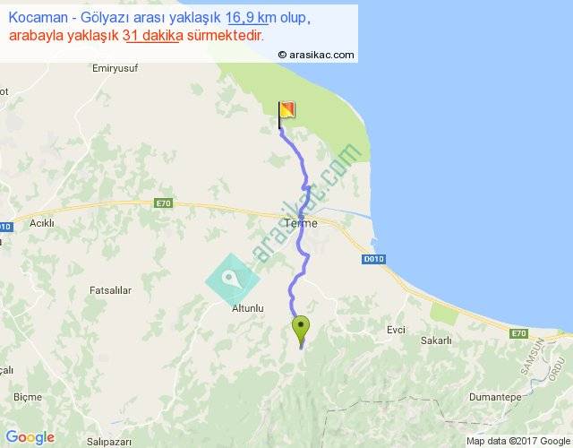 Kocaman - Gölyazı arası yaklaşık olarak 90 km/h ile yukarıda belirtilen sürede olup, iki yerin kuş uçuşu uzaklığı (mesafesi) 14'dir. Yolculuk otobüsle 40 dakika sürmektedir.