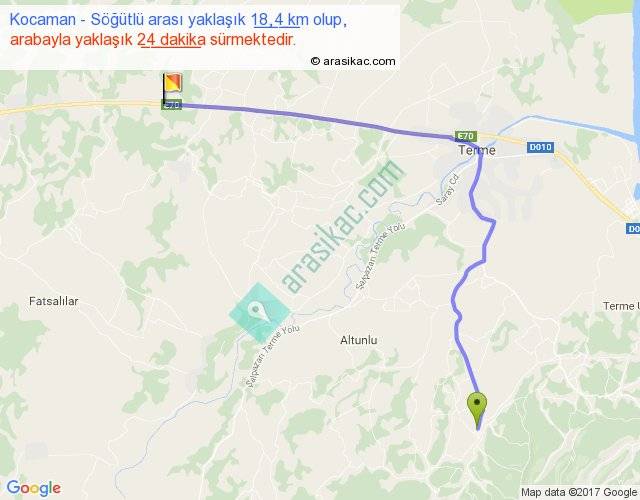 Kocaman - Söğütlü arası yaklaşık olarak 90 km/h ile yukarıda belirtilen sürede olup, iki yerin kuş uçuşu uzaklığı (mesafesi) 13'dir. Yolculuk otobüsle 31 dakika sürmektedir.