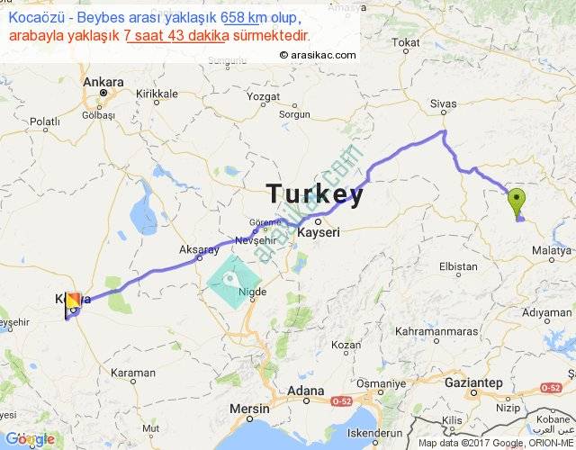 Kocaözü - Beybes arası yaklaşık olarak 90 km/h ile yukarıda belirtilen sürede olup, iki yerin kuş uçuşu uzaklığı (mesafesi) 489'dir. Eğer belirtilen yerler arasında uçak seferi var ise bu süre uçakla 45 dakika'ya kadar düşebilir. Yolculuk otobüsle 10 saat 1 dakika sürmektedir.
