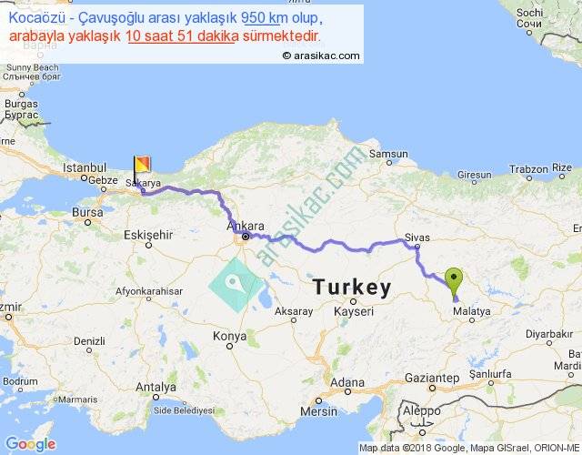 Kocaözü - Çavuşoğlu arası yaklaşık olarak 90 km/h ile yukarıda belirtilen sürede olup, iki yerin kuş uçuşu uzaklığı (mesafesi) 695'dir. Eğer belirtilen yerler arasında uçak seferi var ise bu süre uçakla 1 saat 04 dakika'ya kadar düşebilir. Yolculuk otobüsle 14 saat 6 dakika sürmektedir.