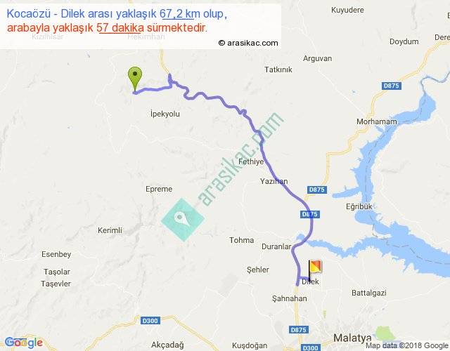 Kocaözü - Dilek arası yaklaşık olarak 90 km/h ile yukarıda belirtilen sürede olup, iki yerin kuş uçuşu uzaklığı (mesafesi) 44'dir. Yolculuk otobüsle 1 saat 14 dakika sürmektedir.