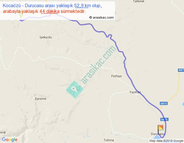 Kocaözü - Durucasu arası yaklaşık olarak 90 km/h ile yukarıda belirtilen sürede olup, iki yerin kuş uçuşu uzaklığı (mesafesi) 37'dir. Yolculuk otobüsle 57 dakika sürmektedir.