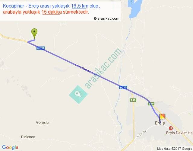 Kocapinar - Erciş arası yaklaşık olarak 90 km/h ile yukarıda belirtilen sürede olup, iki yerin kuş uçuşu uzaklığı (mesafesi) 15'dir. Yolculuk otobüsle 19 dakika sürmektedir.