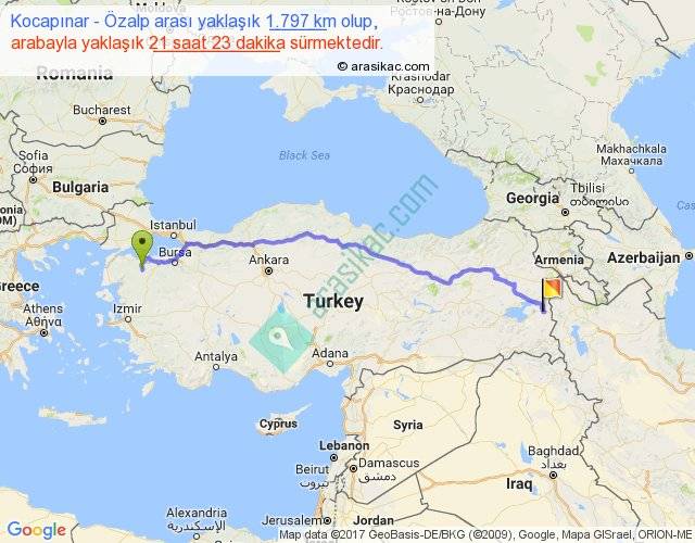 Kocapınar - Özalp arası yaklaşık olarak 90 km/h ile yukarıda belirtilen sürede olup, iki yerin kuş uçuşu uzaklığı (mesafesi) 1397'dir. Eğer belirtilen yerler arasında uçak seferi var ise bu süre uçakla 2 saat 08 dakika'ya kadar düşebilir. Yolculuk otobüsle 1 gün 3 saat sürmektedir.