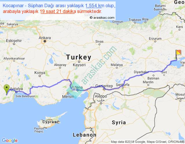 Kocapınar - Süphan Dağı arası yaklaşık olarak 90 km/h ile yukarıda belirtilen sürede olup, iki yerin kuş uçuşu uzaklığı (mesafesi) 1152'dir. Eğer belirtilen yerler arasında uçak seferi var ise bu süre uçakla 1 saat 46 dakika'ya kadar düşebilir. Yolculuk otobüsle 1 gün 1 saat sürmektedir.