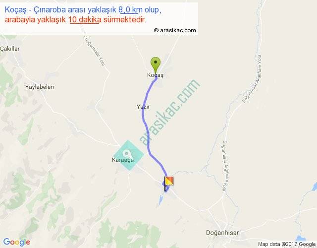 Koçaş - Çınaroba arası yaklaşık olarak 90 km/h ile yukarıda belirtilen sürede olup, iki yerin kuş uçuşu uzaklığı (mesafesi) 7'dir. Yolculuk otobüsle 13 dakika sürmektedir.