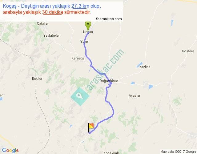 Koçaş - Deştiğin arası yaklaşık olarak 90 km/h ile yukarıda belirtilen sürede olup, iki yerin kuş uçuşu uzaklığı (mesafesi) 20'dir. Yolculuk otobüsle 39 dakika sürmektedir.