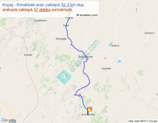 Koçaş - Konakkale arası yaklaşık olarak 90 km/h ile yukarıda belirtilen sürede olup, iki yerin kuş uçuşu uzaklığı (mesafesi) 24'dir. Yolculuk otobüsle 48 dakika sürmektedir.