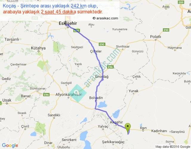 Koçaş - Şirintepe arası yaklaşık olarak 90 km/h ile yukarıda belirtilen sürede olup, iki yerin kuş uçuşu uzaklığı (mesafesi) 199'dir. Yolculuk otobüsle 3 saat 34 dakika sürmektedir.