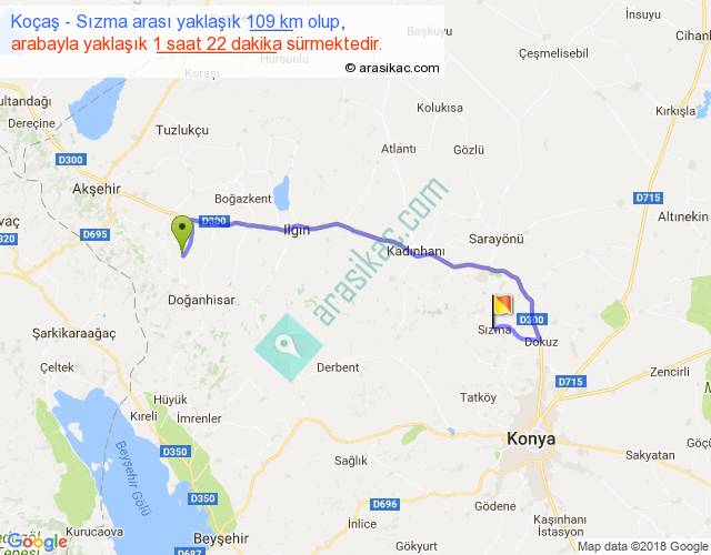 Koçaş - Sızma arası yaklaşık olarak 90 km/h ile yukarıda belirtilen sürede olup, iki yerin kuş uçuşu uzaklığı (mesafesi) 69'dir. Yolculuk otobüsle 1 saat 46 dakika sürmektedir.