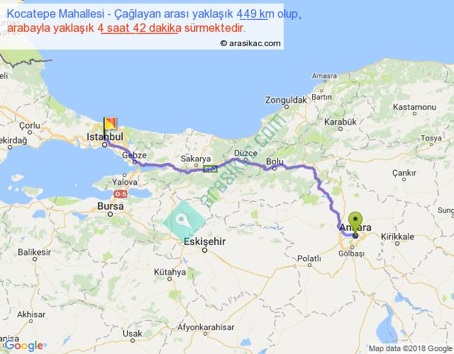 Kocatepe Mahallesi - Çağlayan arası yaklaşık olarak 90 km/h ile yukarıda belirtilen sürede olup, iki yerin kuş uçuşu uzaklığı (mesafesi) 350'dir. Eğer belirtilen yerler arasında uçak seferi var ise bu süre uçakla 32 dakika'ya kadar düşebilir. Yolculuk otobüsle 6 saat 6 dakika sürmektedir.
