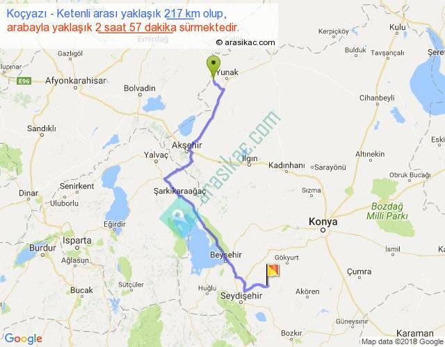 Koçyazı - Ketenli arası yaklaşık olarak 90 km/h ile yukarıda belirtilen sürede olup, iki yerin kuş uçuşu uzaklığı (mesafesi) 146'dir. Yolculuk otobüsle 3 saat 50 dakika sürmektedir.