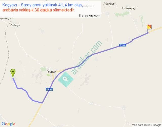 Koçyazı - Saray arası yaklaşık olarak 90 km/h ile yukarıda belirtilen sürede olup, iki yerin kuş uçuşu uzaklığı (mesafesi) 33'dir. Yolculuk otobüsle 39 dakika sürmektedir.