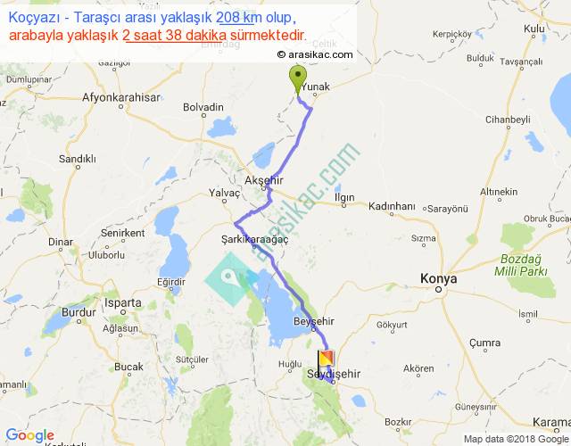Koçyazı - Taraşcı arası yaklaşık olarak 90 km/h ile yukarıda belirtilen sürede olup, iki yerin kuş uçuşu uzaklığı (mesafesi) 151'dir. Yolculuk otobüsle 3 saat 25 dakika sürmektedir.