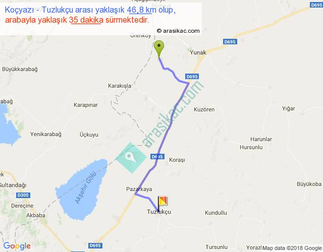 Koçyazı - Tuzlukçu arası yaklaşık olarak 90 km/h ile yukarıda belirtilen sürede olup, iki yerin kuş uçuşu uzaklığı (mesafesi) 36'dir. Yolculuk otobüsle 45 dakika sürmektedir.