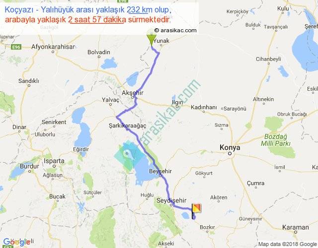 Koçyazı - Yalıhüyük arası yaklaşık olarak 90 km/h ile yukarıda belirtilen sürede olup, iki yerin kuş uçuşu uzaklığı (mesafesi) 170'dir. Yolculuk otobüsle 3 saat 50 dakika sürmektedir.