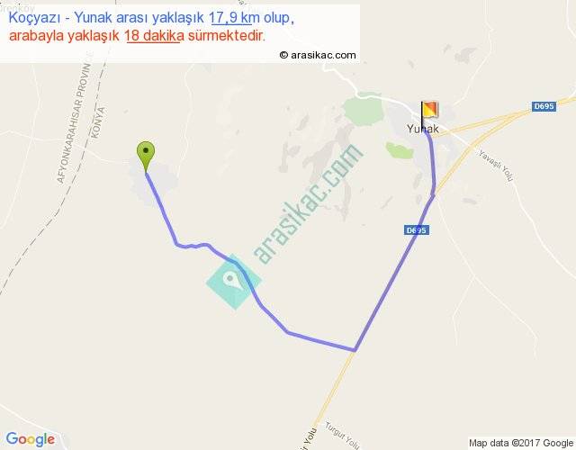Koçyazı - Yunak arası yaklaşık olarak 90 km/h ile yukarıda belirtilen sürede olup, iki yerin kuş uçuşu uzaklığı (mesafesi) 9'dir. Yolculuk otobüsle 23 dakika sürmektedir.