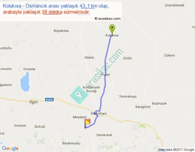Kolukısa - Osmancık arası yaklaşık olarak 90 km/h ile yukarıda belirtilen sürede olup, iki yerin kuş uçuşu uzaklığı (mesafesi) 38'dir. Yolculuk otobüsle 49 dakika sürmektedir.