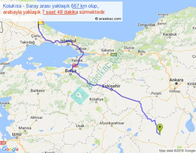 Kolukısa - Saray arası yaklaşık olarak 90 km/h ile yukarıda belirtilen sürede olup, iki yerin kuş uçuşu uzaklığı (mesafesi) 490'dir. Eğer belirtilen yerler arasında uçak seferi var ise bu süre uçakla 45 dakika'ya kadar düşebilir. Yolculuk otobüsle 10 saat 8 dakika sürmektedir.