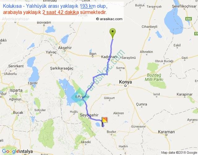 Kolukısa - Yalıhüyük arası yaklaşık olarak 90 km/h ile yukarıda belirtilen sürede olup, iki yerin kuş uçuşu uzaklığı (mesafesi) 135'dir. Yolculuk otobüsle 3 saat 30 dakika sürmektedir.
