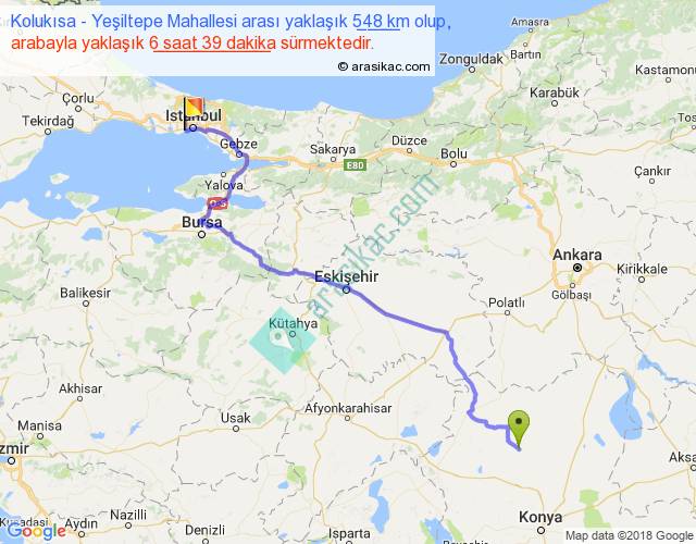 Kolukısa - Yeşiltepe Mahallesi arası yaklaşık olarak 90 km/h ile yukarıda belirtilen sürede olup, iki yerin kuş uçuşu uzaklığı (mesafesi) 396'dir. Eğer belirtilen yerler arasında uçak seferi var ise bu süre uçakla 36 dakika'ya kadar düşebilir. Yolculuk otobüsle 8 saat 38 dakika sürmektedir.