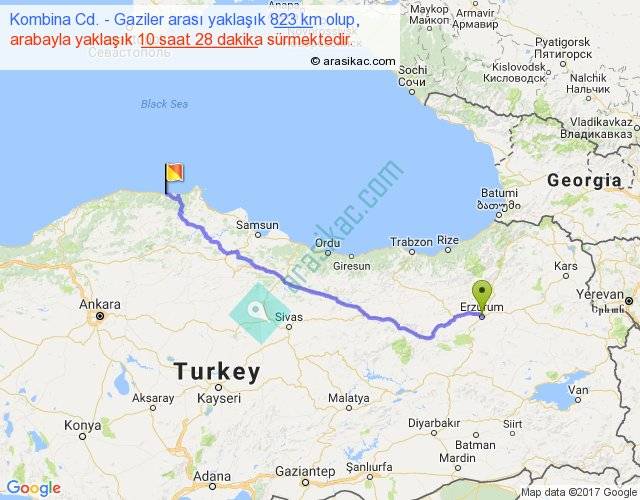 Kombina Cd. - Gaziler arası yaklaşık olarak 90 km/h ile yukarıda belirtilen sürede olup, iki yerin kuş uçuşu uzaklığı (mesafesi) 620'dir. Eğer belirtilen yerler arasında uçak seferi var ise bu süre uçakla 57 dakika'ya kadar düşebilir. Yolculuk otobüsle 13 saat 36 dakika sürmektedir.