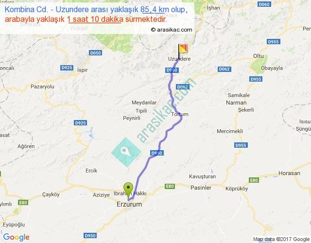 Kombina Cd. - Uzundere arası yaklaşık olarak 90 km/h ile yukarıda belirtilen sürede olup, iki yerin kuş uçuşu uzaklığı (mesafesi) 71'dir. Yolculuk otobüsle 1 saat 31 dakika sürmektedir.