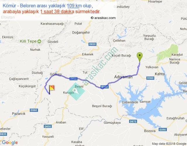 Kömür - Beloren arası yaklaşık olarak 90 km/h ile yukarıda belirtilen sürede olup, iki yerin kuş uçuşu uzaklığı (mesafesi) 78'dir. Yolculuk otobüsle 2 saat 7 dakika sürmektedir.