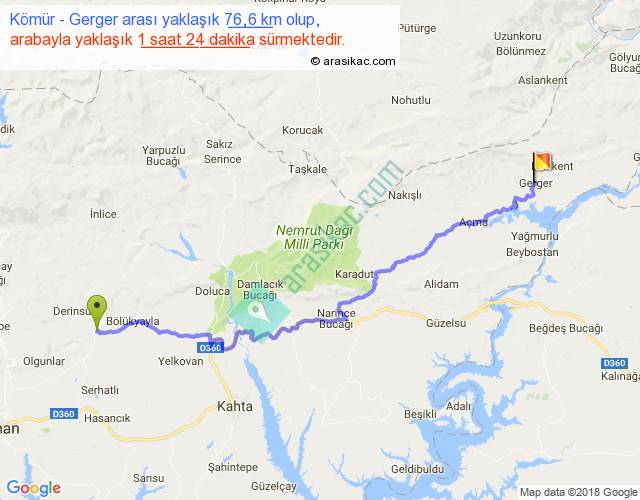 Kömür - Gerger arası yaklaşık olarak 90 km/h ile yukarıda belirtilen sürede olup, iki yerin kuş uçuşu uzaklığı (mesafesi) 55'dir. Yolculuk otobüsle 1 saat 49 dakika sürmektedir.