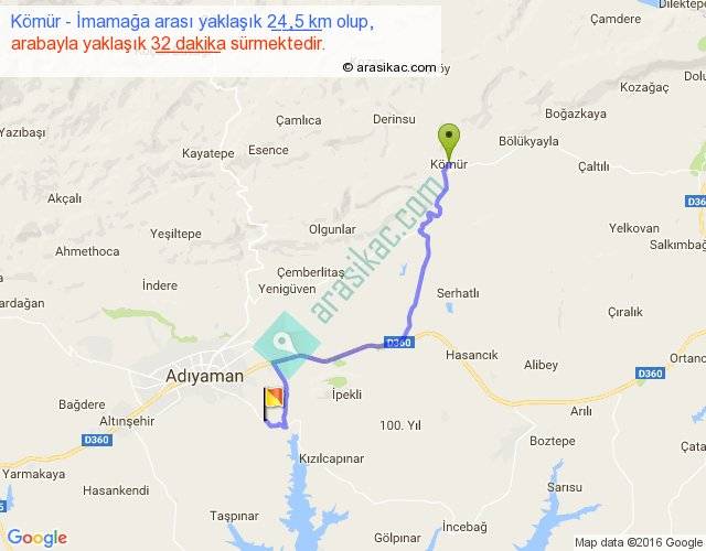 Kömür - İmamağa arası yaklaşık olarak 90 km/h ile yukarıda belirtilen sürede olup, iki yerin kuş uçuşu uzaklığı (mesafesi) 17'dir. Yolculuk otobüsle 41 dakika sürmektedir.