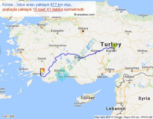 Kömür - İnlice arası yaklaşık olarak 90 km/h ile yukarıda belirtilen sürede olup, iki yerin kuş uçuşu uzaklığı (mesafesi) 623'dir. Eğer belirtilen yerler arasında uçak seferi var ise bu süre uçakla 57 dakika'ya kadar düşebilir. Yolculuk otobüsle 13 saat 53 dakika sürmektedir.