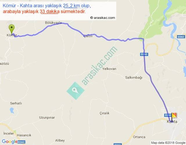 Kömür - Kahta arası yaklaşık olarak 90 km/h ile yukarıda belirtilen sürede olup, iki yerin kuş uçuşu uzaklığı (mesafesi) 19'dir. Yolculuk otobüsle 42 dakika sürmektedir.