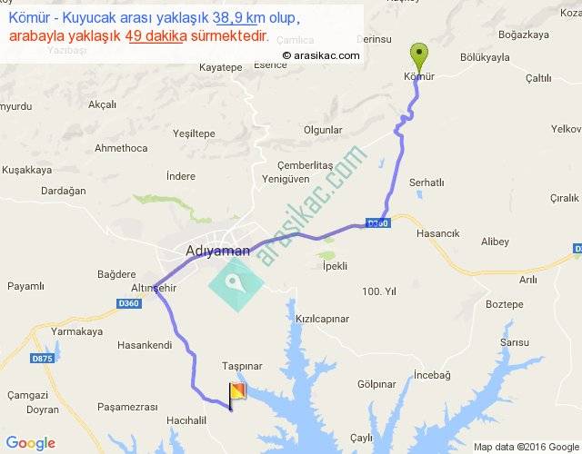 Kömür - Kuyucak arası yaklaşık olarak 90 km/h ile yukarıda belirtilen sürede olup, iki yerin kuş uçuşu uzaklığı (mesafesi) 25'dir. Yolculuk otobüsle 1 saat 3 dakika sürmektedir.
