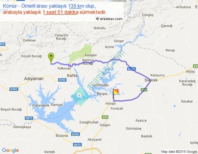 Kömür - Ömerli arası yaklaşık olarak 90 km/h ile yukarıda belirtilen sürede olup, iki yerin kuş uçuşu uzaklığı (mesafesi) 55'dir. Yolculuk otobüsle 2 saat 24 dakika sürmektedir.
