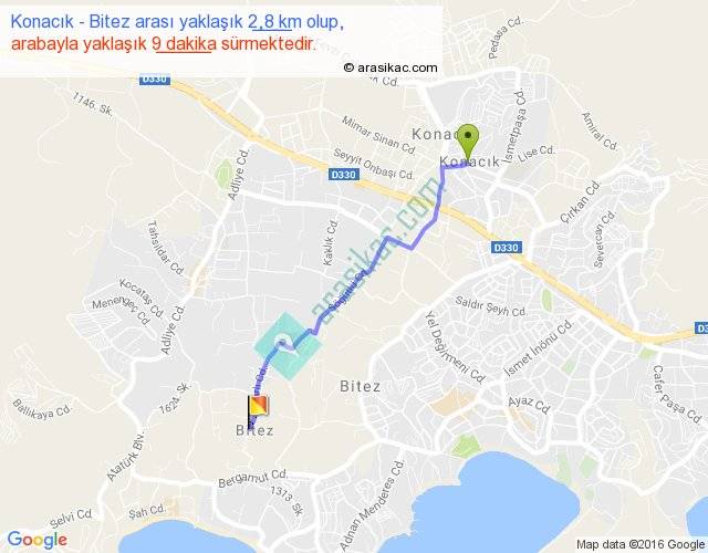 Konacık - Bitez arası yaklaşık olarak 90 km/h ile yukarıda belirtilen sürede olup, iki yerin kuş uçuşu uzaklığı (mesafesi) 2'dir. Yolculuk otobüsle 11 dakika sürmektedir.