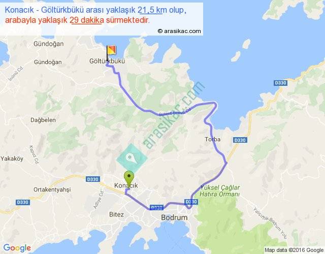 Konacık - Göltürkbükü arası yaklaşık olarak 90 km/h ile yukarıda belirtilen sürede olup, iki yerin kuş uçuşu uzaklığı (mesafesi) 8'dir. Yolculuk otobüsle 37 dakika sürmektedir.