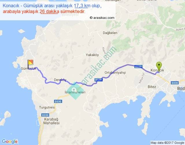 Konacık - Gümüşlük arası yaklaşık olarak 90 km/h ile yukarıda belirtilen sürede olup, iki yerin kuş uçuşu uzaklığı (mesafesi) 14'dir. Yolculuk otobüsle 33 dakika sürmektedir.